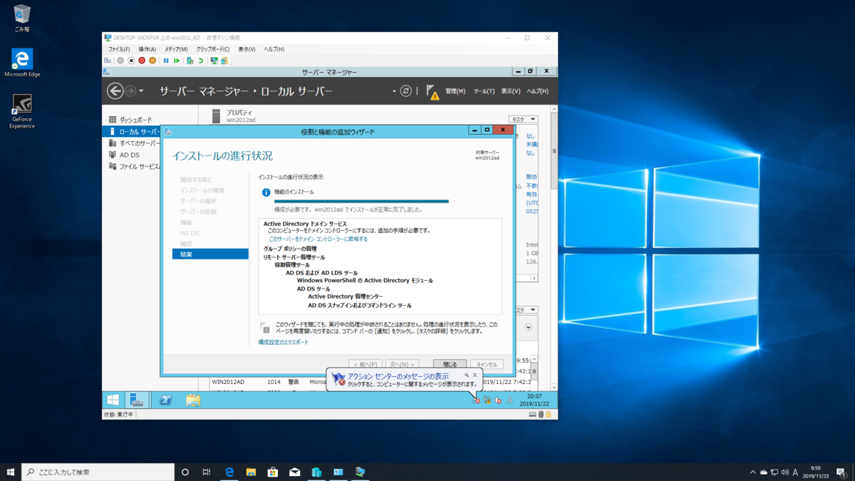 2019-11-24 AD作成(2) IT 引き続きAD作成続けていきます。 こんな感じで終わりました。 次にAD構成ウィザード進めてきます。 !?!?エラー?あ、DNSサーバいれわすれたか・・・ その後無事AD入れ終わりました。次はメンバサーバの構成かな。
